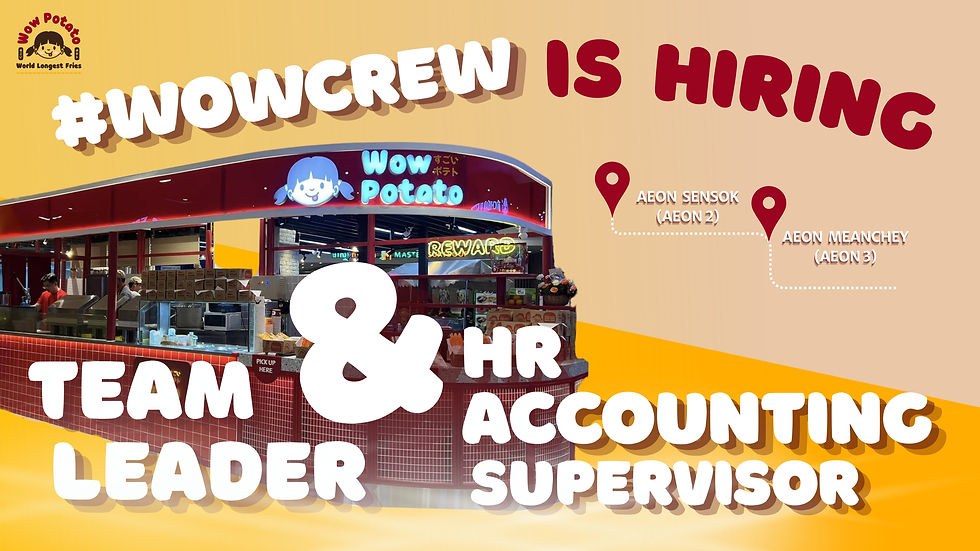 Wow Potato, Cambodia’s premier destination for the famous 30cm Long Fries, is currently seeking experienced and dynamic leaders to join our expanding operations. We are recruiting for key roles at our Head Office and our premier shopping destination outlets at Aeon Mall 2 (Sen Sok City) and Aeon Mall 3 (Mean Chey).